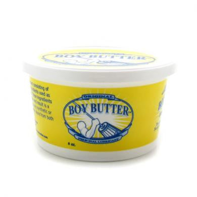 BOY BUTTER Original is an oil-based lubricant consisting of two powerful yet gentle ingredients: a coconut oil and an organic silicone blend. The ingredients are homogenized like real butter and the end result is a personal lubricant that will last as long as any synthetic or silicone lubricants yet washes off with water alone, from both skin and fabric. Boy Butter Original is long lasting, hypoallergenic and is safe on all toys.